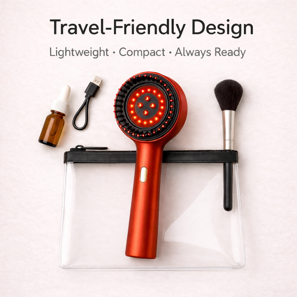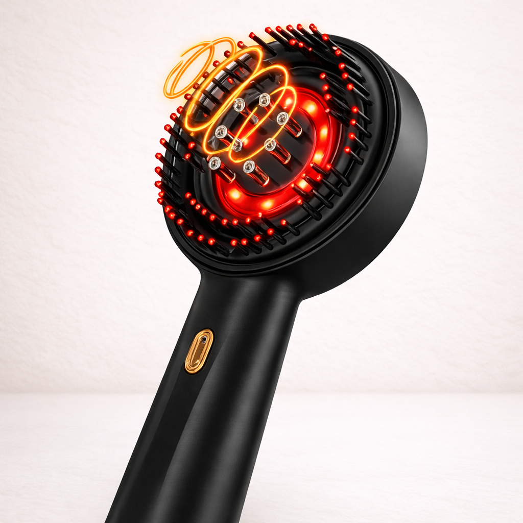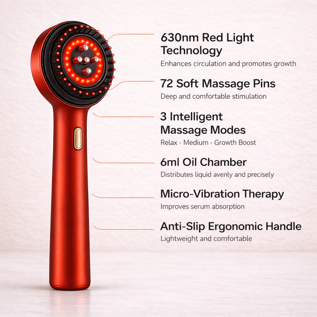 Powered by 630nm red-light therapy and deep micro-massage, ScalpRay Grow™ boosts circulation, strengthens follicles, and reduces shedding from the very first week. Its precision serum-infusion system nourishes the scalp while you massage, enhancing absorption and accelerating visible results.